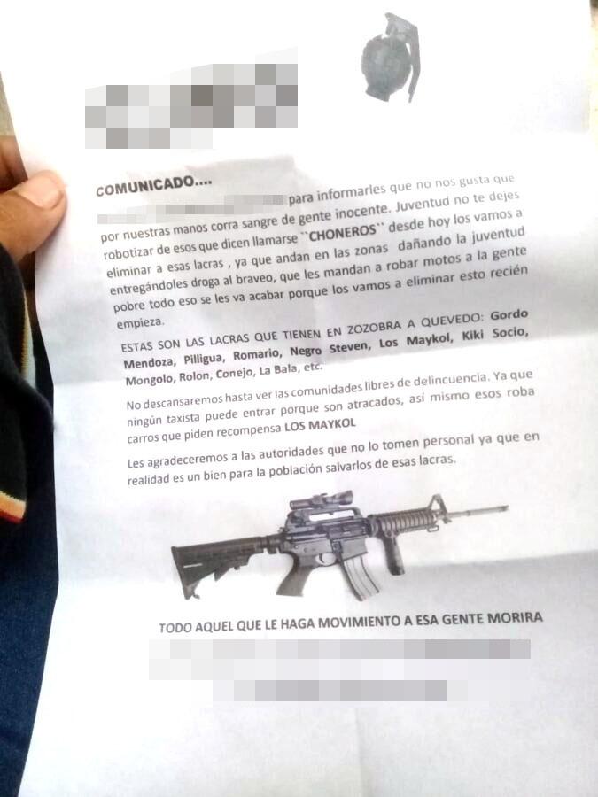No solo en el cantón Que vedo, sino en algunas pro vincias del Ecuador circulan videos y panfletos amenazantes, los cuales mantienen a la población en zozobra. Muchos te men salir de sus casas, a realizar sus actividades diarias. Las llamadas anó nimas que algunas personas reciben a diario, también los pone nervioso.
