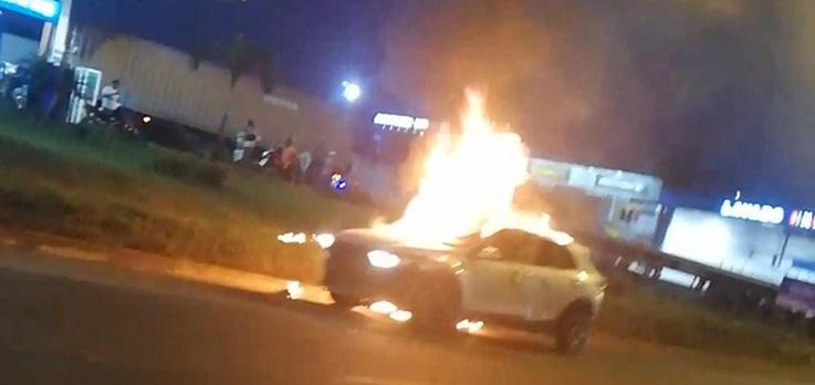 En las imágenes se ob serva cuando dos hombres se bajan en medio de las llamas y cruzan la vía para embarcarse en motocicletas que esperaban al otro lado.