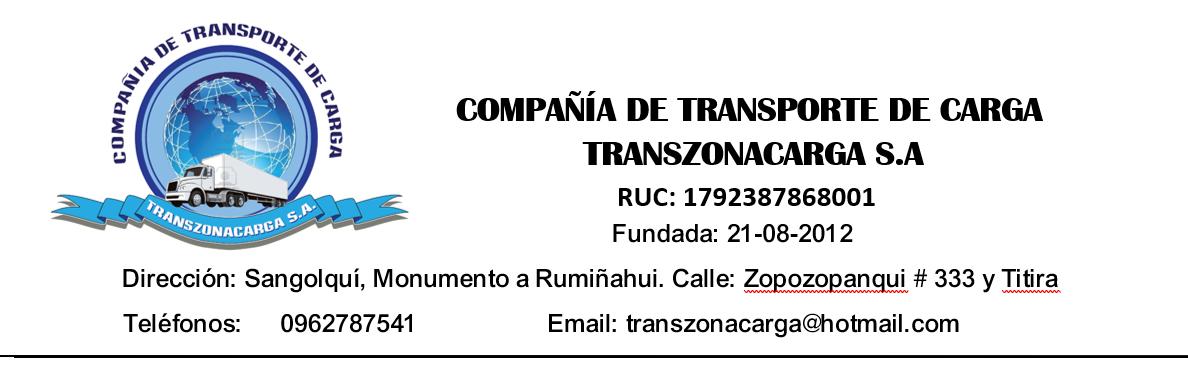 De acuerdo con lo dispuesto en el Art. 236 de la Ley de Compañías de la República del Ecuador y el Artículo Décimo Octavo del Estatuto Social de la COMPAÑÍA DE TRANSPORTE DE CARGA TRANSZONACARGA S.A., se convoca a todos los Accionistas a JUNTA GENERAL EXTRAORDINARIA DE ACCIONISTAS, a celebrarse el día sábado 9 de septiembre de 2023, a las 10:00 horas, en la oficina de la Compañia, ubicada en el Barrio San Sebastian, calle Zopozopanqui #333 y Titira de la ciudad de Sangolquí, con el objeto de tratar el siguiente orden del día: