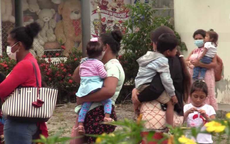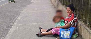 Sentada en el piso cerca de una parada de bus, María de 26 años y sus dos pequeños hijos pi den limosna.
