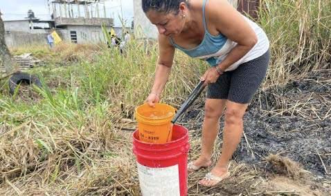 Los habitantes del sector La Judith, parroquia San Cristóbal, Quevedo, se abastecen de agua llenando baldes y ollas desde una manguera conectada en la calle.