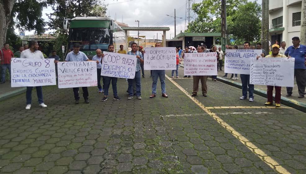 Con pancartas, en grupo y alzando su voz de protesta, decenas de transportistas urbanos de la ciudad de Quevedo llegaron hasta las instalaciones de la Ciudadela Municipal para reclamar por el alza del pasaje.