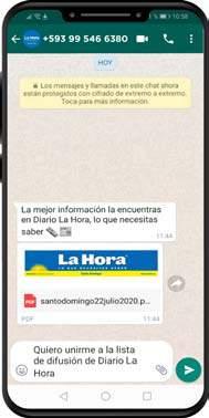 Edición Digital REvista sEmanal la HoRa DE opinaR PUBLICIDAD 21 SANTO DOMINGO LUNES 13/MARZO/2023 P MÁS DE 101.361 SEGUIDORES EN FACEBOOK santodomingolahora MÁS DE 10.688 SEGUIDORES EN INStAGRAm santodomingolahora lahora.com.ec lahora.com.ec nuestra Circulación MÁS DE 1’520.868 DE pROmEDIO DE pERSONAS AlCANzADAS CADA mES EN FACEBOOK MÁS DE 12.475 DE pROmEDIO DE pERSONAS AlCANzADAS CADA mES EN INStAGRAm MÁS DE 3’942.000 VISItAS EN NUEStRA WEB www.lahora.com.ec MÁS DE 65.200 AlCANCES EN WhAtSApp +593 99 546 6380