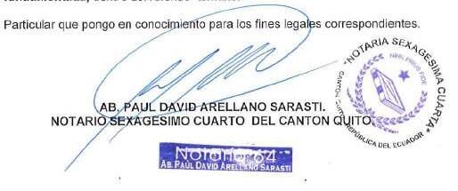 NOTARIA SEXAGESIMA CUARTA DEL CANTON QUITO.- Cúmpleme poner en conocimiento del Público que mediante escritura pública otorgada ante mí, ABOGADO PAUL DAVID ARELLANO SARASTI NOTARIO SEXAGÉSIMO