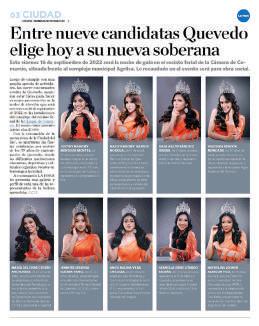 ‘La Ciudad del Río’ tendrá nueva Reina ° La nueva Reina de Quevedo será electa esta noche. El evento de belleza iniciará a las 20:00 y se desarrollará en el Recinto Ferial. Son ocho hermosas jóvenes que aspiran al título máximo de belleza. La soberana y su corte de honor presidirán las actividades de cantonización de la ‘Ciudad del Río’. (JO)