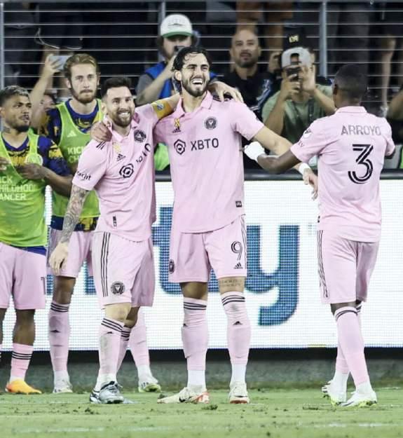 FUTBOLISTA. Leonardo Campana (c), del Inter Miami, celebra con Lionel Messi (i) y Dixon Arroyo (d).