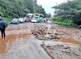 La vía L oja-Catamayo fue la más afectada, aquí un deslave de tierra, acompañado de agu a y ca ída de roca s, hiz o