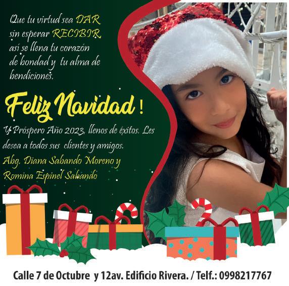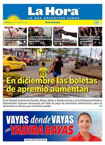 OPINIÓN 02 SANTO DOMINGO JUEVES 22/DICIEMBRE/2022 O Directora Nacional: Gabriela Vivanco Salvador Editor General: Jean Cano Editora Santo Domingo de los Tsáchilas: Lorena Melo Mieles Redacción: lmelo@lahora.com.ec Publicidad: 099 787 8732 Año: XXVII No. 10.787 Editor Los Ríos: Marco Campos Coro Redacción: editorlosrios@lahora.com.ec Publicidad: 096 277 2793 Año: XXIV No. 8.723