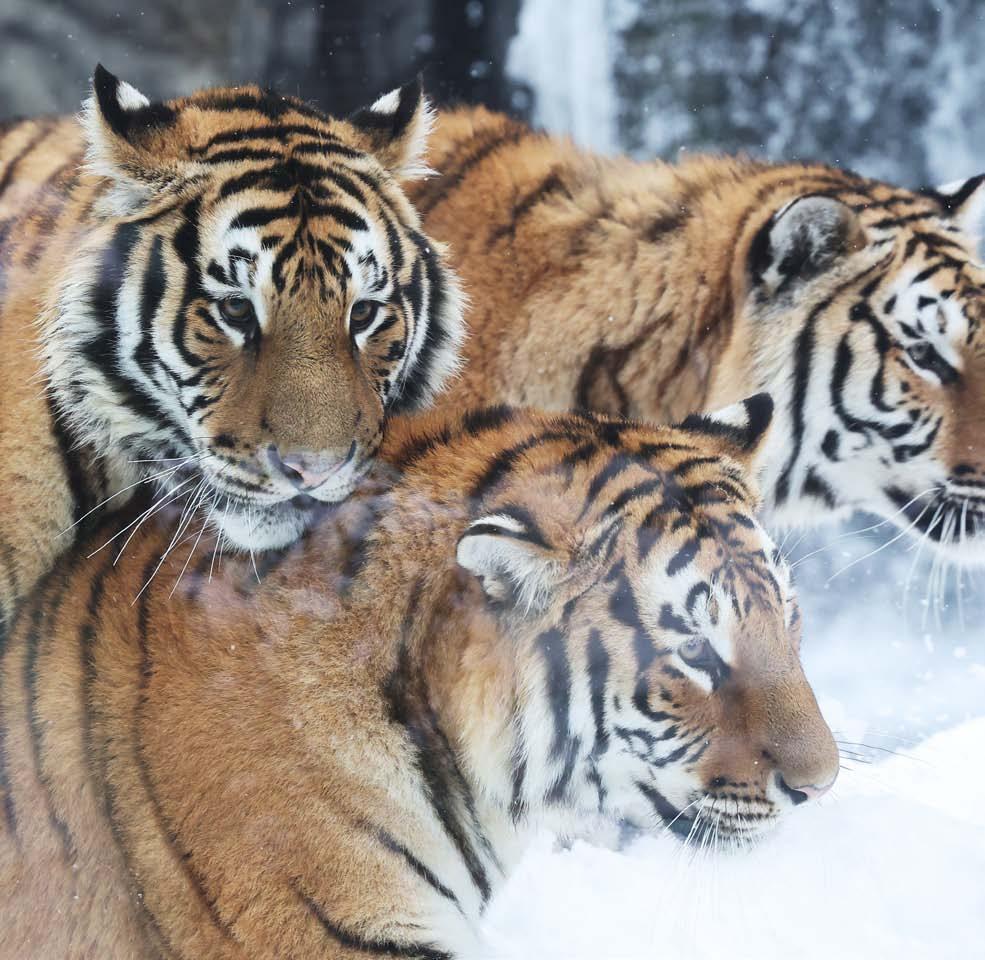 Unos tigres juegan este 22 de diciembre de 2022 en el parque de fauna de Yongin, en medio de las fuertes nevadas que están azotando toda la región de Corea del Sur. EFE