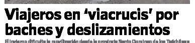 de universidad estatal no avanza La ilusión de cientos de jóvenes se desvanece al saber que el proyecto de la universidad estatal para Santo Domingo de los Tsáchilas está paralizado. Creen que ha faltado voluntad política. 05 Durante el fin de semana se presentaron varios deslizamientos de tierra en esta arteria que une a la Sierra con la Costa. Por la gravedad de la afectación en el kilómetro 56, jurisdicción de Pichincha se dispuso cerrarla a las 18:00 de ayer. 03