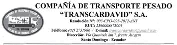 De conformidad a lo establecido en el Art. 231 – 234 – 236 de la Ley de Compañías, y de acuerdo al Estatuto Social de la Compañía se convoca a todos los Señores Accionistas de la Compañía de Transporte Pesado TRANSCARDAVID S.A., a la JUNTA GENERAL EXTRAORDINARIA DE ACCIONISTAS que se llevará a cabo el día viernes 02 de diciembre del 2022, a las 19H00, en la ciudad de Santo Domingo, en el domicilio social de la institución ubicada en la Vía Quininde km 7, frente Asogan, con el objeto de conocer y resolver el siguiente orden del día: