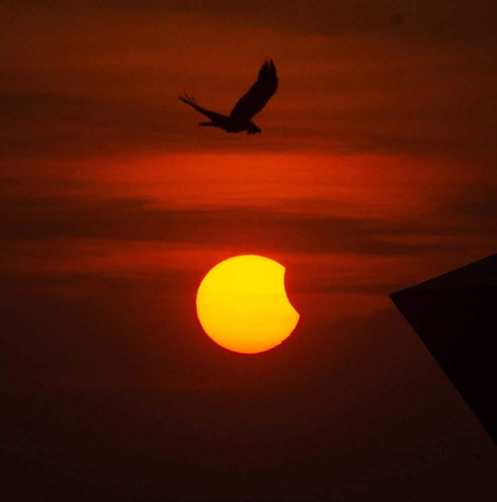 pájaro vuela mientras la l una cubre parcialmente el s ol durante un eclipse solar parcial, en c hennai, i ndia, el 25 de octubre de 2022. e F e / e PA Postal de un eclipse solar en india