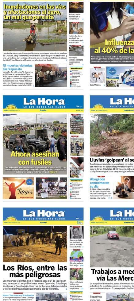 Edición Digital REvista sEmanal la HoRa DE opinaR PUBLICIDAD 17 SANTO DOMINGO LUNES 28/AGOSTO/2023 P JUEVES24DEAGOSTODE2023 Entregan atextosliterarios unidad educativa Padreehijo juntoacribillados mujerauna Grupoliterario yÉbano,Tsáchila aniversarioMarfilestáde deNuevochoque Justiciatrenesenla adelLosvacíosReglamento laLeyde Comunicación Lafiguradela tienePrimeraDama culturalunpeso en elpaís 04 06 05 08 09 10 ciudad SucESOS cuLTuRa JuSTicia PaÍS SOciEdad 07ElGobiernodeLassoexplotaráelITTpeseaconsulta Tresañospidiendojusticiaporel EnasesinatodeCristinaBalcázar encontradoel2020,elcadáverdeCristinaBalcázarconsietemesesdegestaciónfue en un lote baldío. El informe de la autopsia reveló que murió asuscausadeunaasfixiamecánicaporestrangulaciónmanual,desdeentonces familiarespidenjusticiayqueseencarcelealprincipalsospechoso. 03 EcONOMÍa MÁS DE 108.701 SEGUIDORES EN FACEBOOK santodomingolahora MÁS DE 11.330 SEGUIDORES EN INStAGRAm santodomingolahora lahora.com.ec lahora.com.ec nuestra Circulación MÁS DE 1’520.868 DE pROmEDIO DE pERSONAS AlCANzADAS CADA mES EN FACEBOOK MÁS DE 12.475 DE pROmEDIO DE pERSONAS AlCANzADAS CADA mES EN INStAGRAm MÁS DE 3’942.000 VISItAS EN NUEStRA WEB www.lahora.com.ec MÁS DE 65.200 AlCANCES EN WhAtSApp +593 99 546 6380