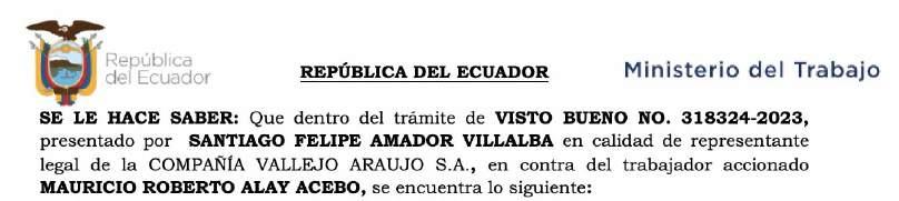 EN LO PRINCIPAL: PRIMERO: Al amparo en lo que señalan los artículos 183 y 621 del Código del Trabajo y el Art. 9 del Acuerdo Ministerial MDT-2021219, en virtud de que la parte actora ha presentado los requisitos declara bajo juramento que le es imposible determinar la individualidad, domicilio o residencia del trabajador MAURICIO ROBERTO ALAY ACEBO; por lo que se ordena, de conformidad con el numeral 1 del Art. 56 del Código Orgánico General de procesos, emitir el correspondiente extracto, a fin de notificar al trabajador MAURICIO ROBERTO ALAY ACEBO, mediante una publicación, en un periódico de amplia circulación del lugar; de no haberlo, se hará en un periódico de la capital de la provincia, así mismo de amplia circulación y si tampoco hay, en uno de amplia circulación nacional, donde se le hace saber al trabajador, que tiene que dar contestación a la solicitud de Visto Bueno planteada en su contra siendo su obligación la de señalar casilla judicial para futuras notificaciones. Transcurrido VEINTE (20) DÍAS desde la última publicación, comenzará el término que tiene la parte accionada para contestar la Solicitud de Visto Bueno, conforme lo determina el Art. 151 del Código Orgánico General de Procesos. Con su contestación o en rebeldía, realícense las investigaciones de conformidad con la Ley; SEGUNDO: De manera expresa, se le concede el término de 10 días a la parte actora, para que presente la publicación; lapso de tiempo que transcurre a partir de la notificación de la presente providencia; TERCERO: Agréguese al expediente los documentos que se adjuntan a la petición de Visto Bueno. Téngase en consideración los medios probatorios detallados en la solicitud de Visto Bueno, en cumplimiento con lo que establece el numeral 7 del Art. 142 y numeral 5 del Art. 143 del Código Orgánico General de Procesos, los cuales serán analizados y proveídos en el momento procesal oportuno y conforme corresponda a Derecho; y, CUARTO: Notifíquese a la parte actora en los correos electrónicos señalados para futuras notificaciones.- NOTIFÍQUESE.- f) Abg. Joyce Bajaña Llerena, Inspectora Provincial de Trabajo del Guayas. Lo que comunico a usted para los fines de ley. Guayaquil, 26 de julio de 2023.-
