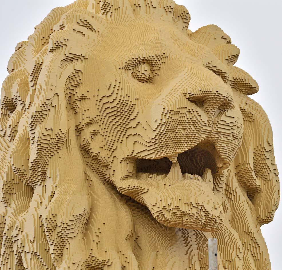una estatua de león construida con ladrillos lego se ve durante su ceremonia de inauguración del emblemático Puente de las Cadenas que se extiende sobre el río Danubio entre Buda y Pest, en Budapest, Hungría. la figura pesa alrededor de 3 toneladas y se completó en 28 días a partir de 850.000 elementos en el proyecto conjunto de A-Hid, Budapest Brand Office y lego Company. eFe