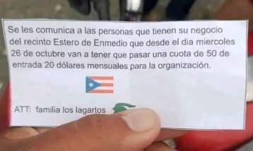 En el cantón Vinces, pro vincia de Los Ríos, los pro pietarios de varios locales comerciales, en el recinto Estero de Enmedio, reci bieron supuestos mensajes de parte de los integrantes de la denominada banda delictiva ‘Los Lagartos’... ‘Van a pagar una cuota de 50 dólares de entrada y 20 mensuales’, señalaba la su puesta organización en el escrito’.