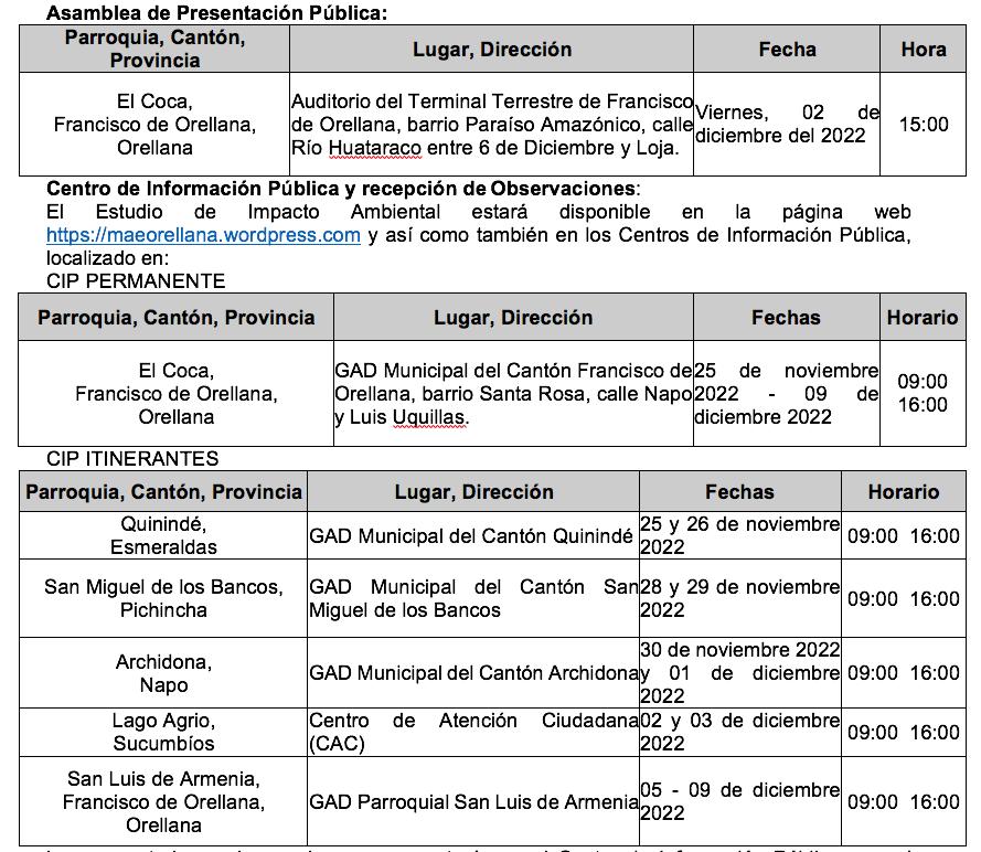 El Ministerio del Ambiente, Agua y Transición Ecológica, como Autoridad Ambiental y el señor Darwin Danilo Rodríguez ValverdeGerente Compañía de Transportes Pesados Transcoca S.A., como Operador del proyecto, en cumplimiento de la aplicación de los mecan ismos de participación ciudadana establecidos en el Código Orgánico del Ambiente, Reglamento del Código Orgánico del Ambiente, Acuerdo Ministerial No. 013 y Acuerdo Ministerial Nro. MAAE-2020-20, invitan al público en general y en especial a los moradores de la parroquia San Luis de Armenia, cantón Francisco de Orellana, provincia de Orellana, a participar en el: PROCESO DE PARTICIPACIÓN CIUDADANA DEL PROYECTO ESTUDIO DE IMPACTO Y PLAN DE MANEJO AMBIENTAL DE LA COMPAÑÍA DE TRANSPORTES PESADOS TRANSCOCA S. A., PARA EL TRANSPORTE PESADO DE MATERIALES Y DESECHOS PELIGROSOS A NIVEL NACIONAL.