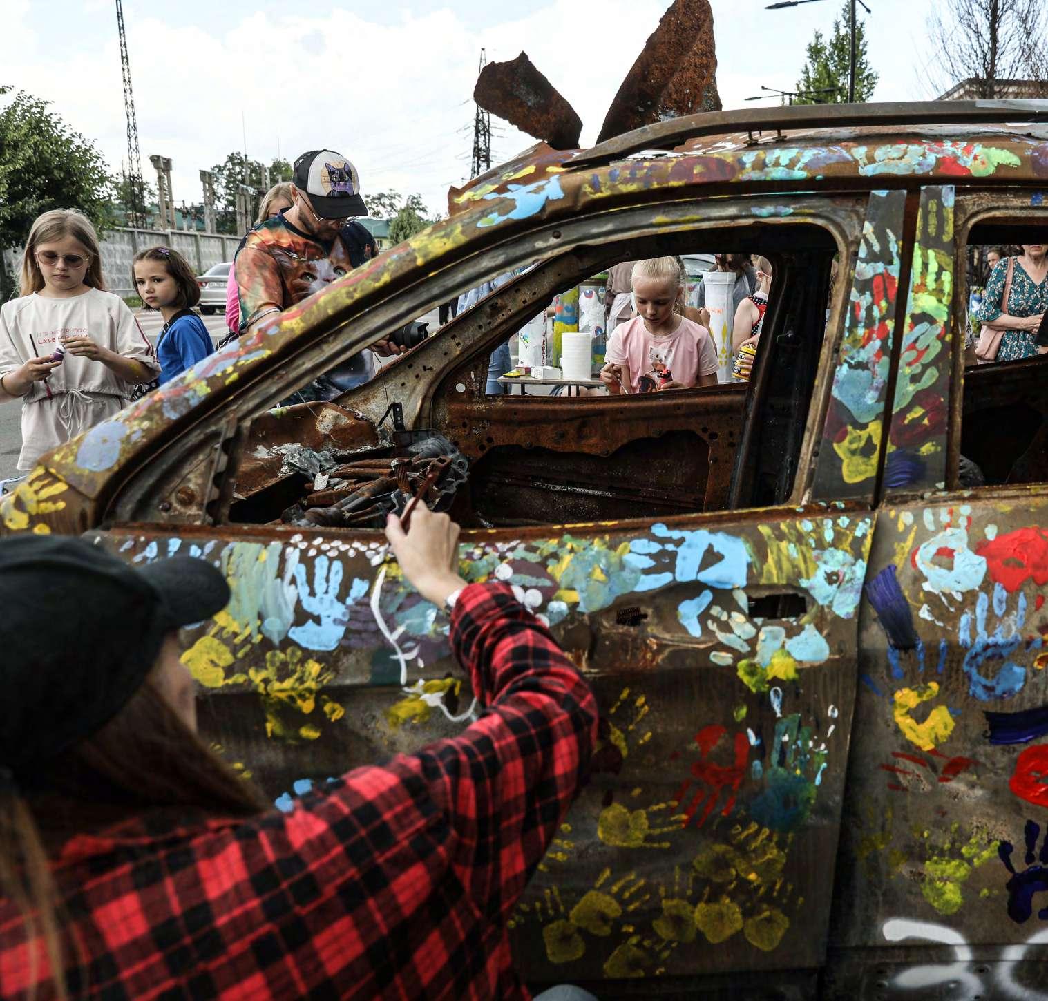 Artistas pintan junto a un grupo de niños coches quemados durante los combates entre las tropas ucranianas y rusas, en Bucha (Ucrania). El presidente ucraniano, Volodímir Zelenski, informó de la decisión de reforzar la frontera con Bielorrusia tras presidir una reunión del Estado Mayor, en la que se le comunicaron los avances en el campo de batalla. EFE/ Oleg Petrasyuk