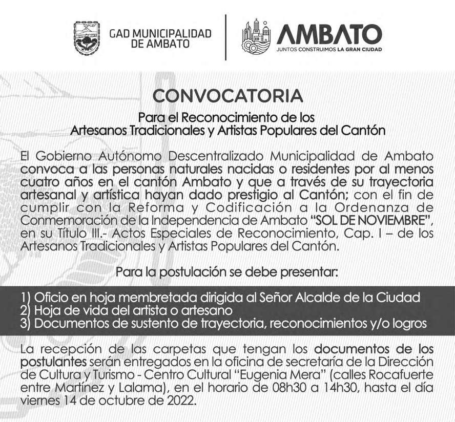 El Municipio de Ambato, la Federación Deportiva de Tungurahua e instituciones privadas como la Cooperativa de Ahorro y Crédito Oscus, realizarán la Competencia Atlética ‘10K Independencia de Ambato’ que se desarrollará el domingo 30 de octubre. Las inscripciones inician el lunes 3 de octubre a través de la página www.10independenciadeambato.com , para mayor información puede contactar se al 099 504 0437 o acceder a https:// wa.link/n0bf9g.