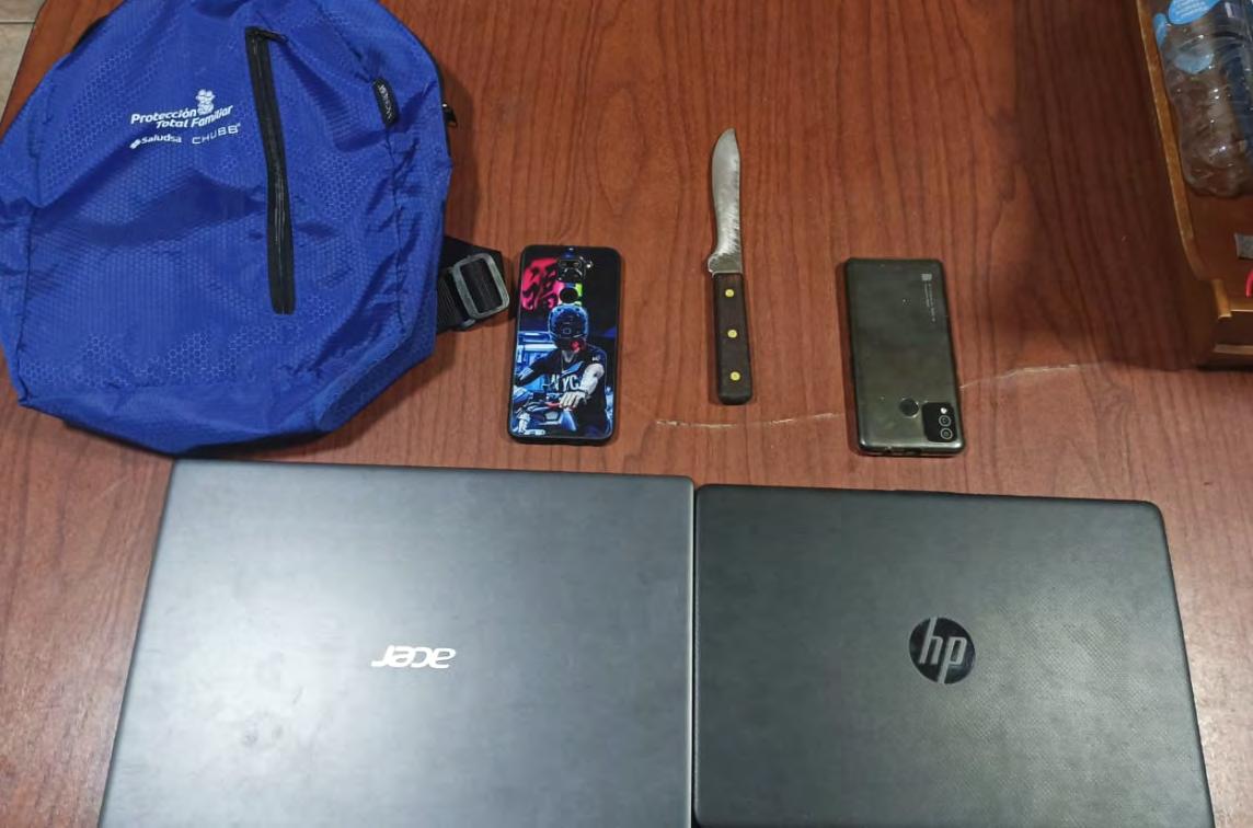 Este se encontraba caminando como si nada cargando una mochila. Al ser revisado, los policías encontraron en su poder los dos computadores y los dos celulares que minutos antes robó, así como el cuchillo con el que amedrentaba a sus víctimas.