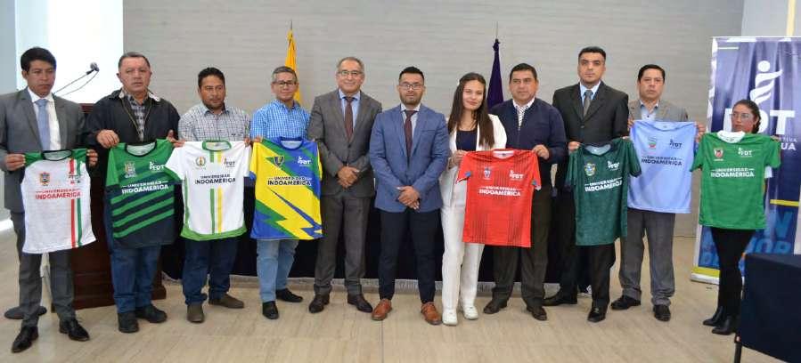La Universidad Indoaméri ca, por dos años consecutivos, entregó la indumentaria oficial de las Olimpiadas Intercantonales FDT - Indoamérica 2022 – 2023, a la Federación Deportiva Provincial de Tungurahua (FDT).