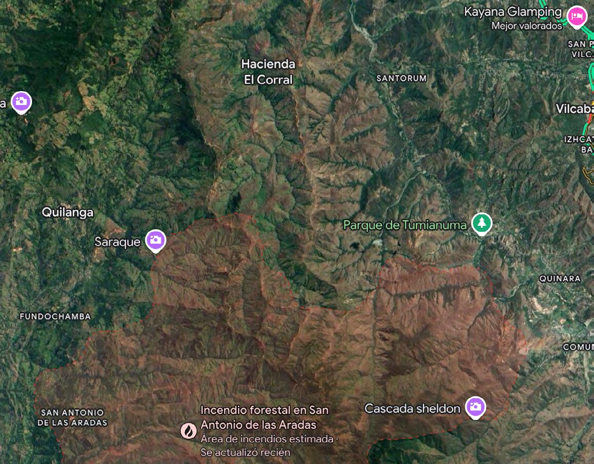 DAÑOS. El incendio forestal en Quilanga ha consumido aproximadamente 7.600 hectáreas de vegetación, afectando bosques, pastizales y tierras de cultivo. Foto: Google Maps.
