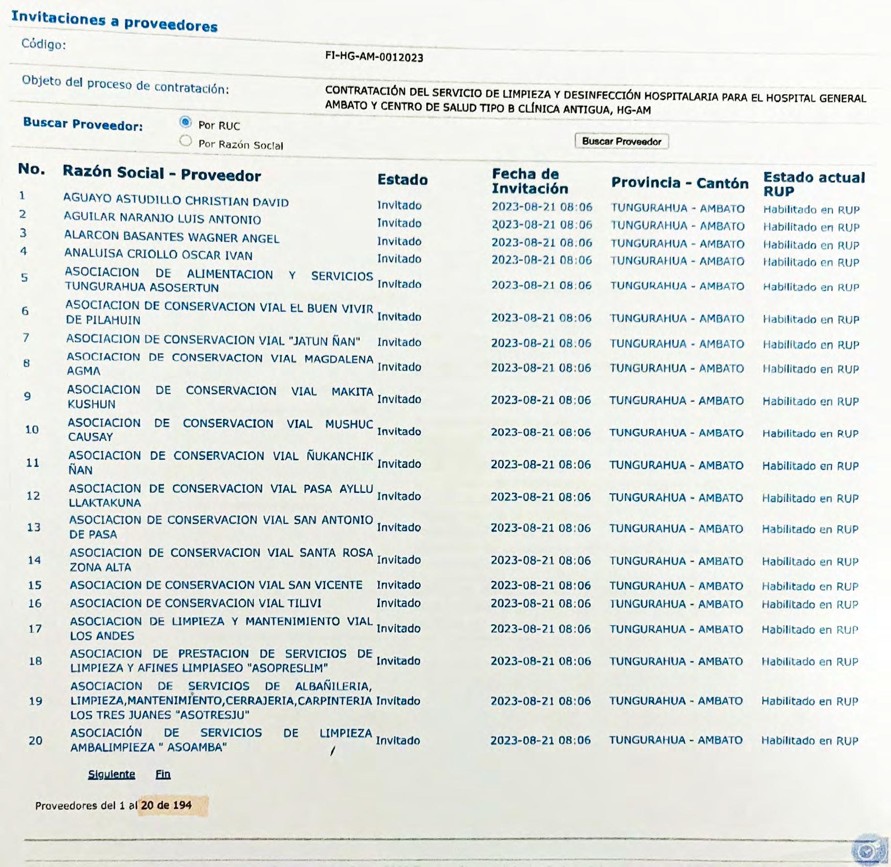 inclusiva para la ‘Contratación de servicio de limpieza y desinfección hospitalaria para el Hospital General Ambato y Centro de Salud tipo B clínica antigua, HG-AM’.