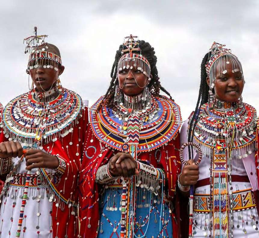 Mujeres de la tribu de los Masai, ataviadas en sus tradicionales trajes, posan este sábado en Kajiado (Kenia). La tribu de los Masai celebra sus particulares Olimpiadas, cuya primera edición tuvo lugar en 2012, que son organizadas por los jefes de las tribus Masai y el grupo de conservación de la vida salvaje ‘Big Life Foundation’ para ofrecer a los Masai una alternativa a la caza de leones en la zona. (EFE/Daniel Irungu)