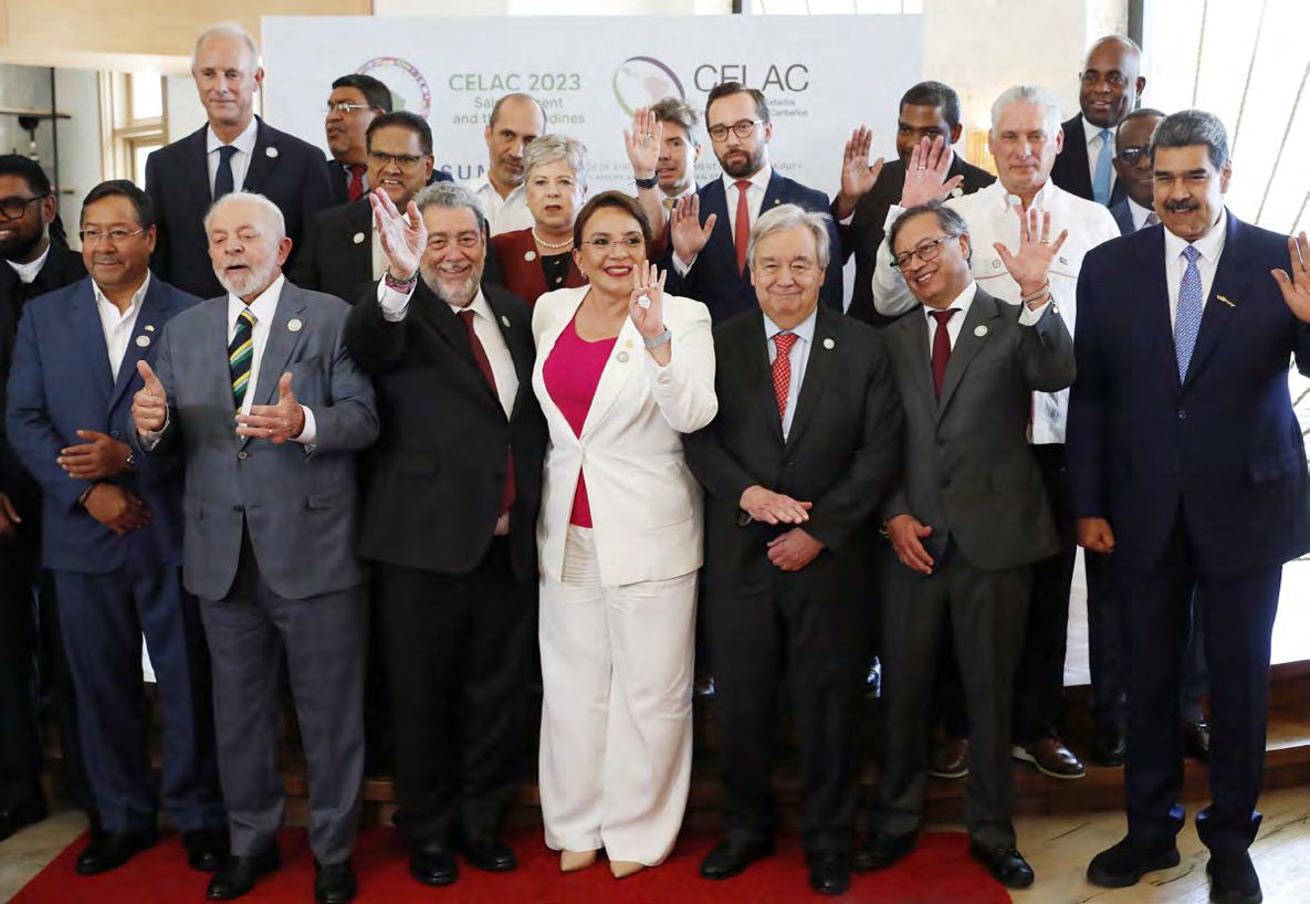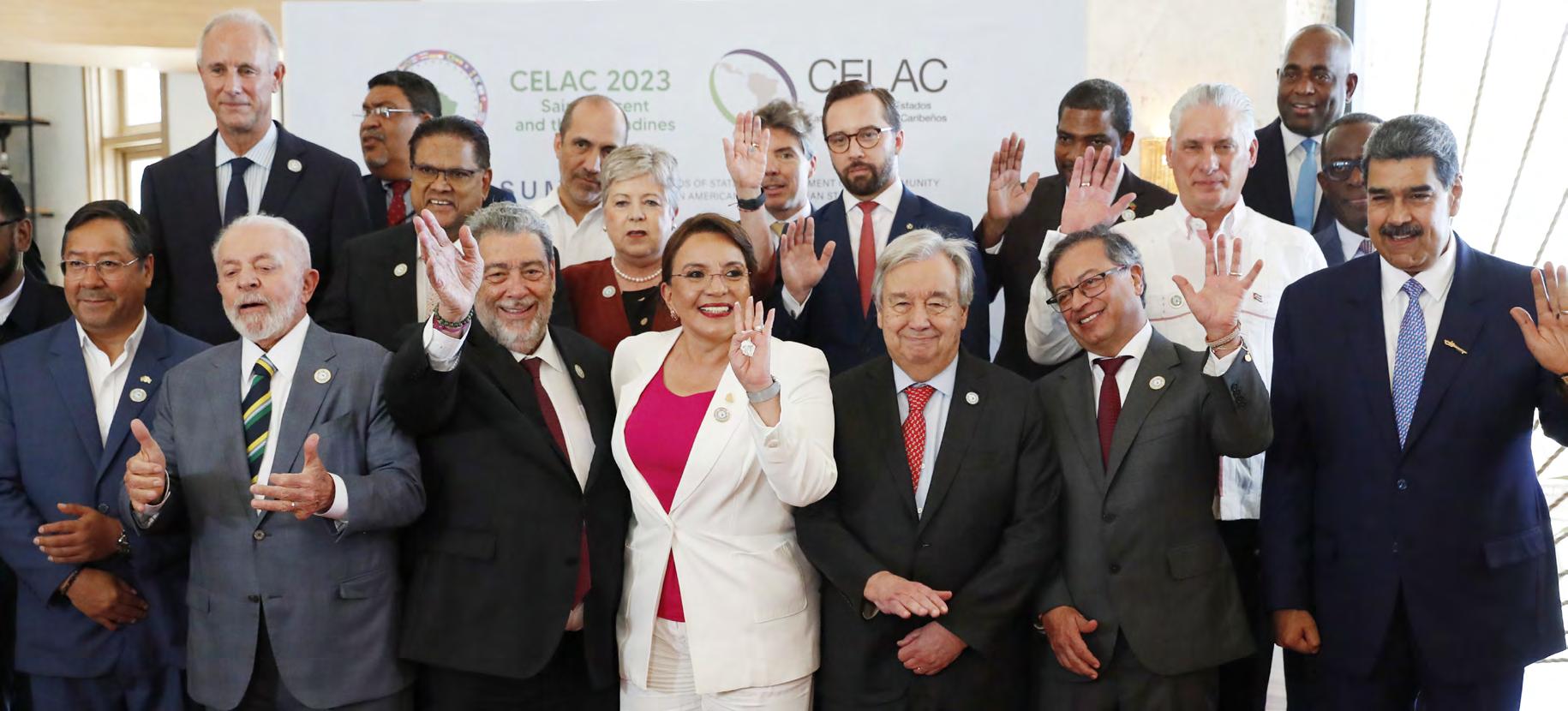 MANDATARIOS. Desde la izquierda en la primera fila: Los presidentes de Bolivia, Luis Arce; de Brasil, Luiz Inácio Lula da Silva; de Honduras, Xiomara Castro; el secretario general de las Naciones Unidas (ONU), Antonio Guterres; los mandatarios de Colombia, Gustavo Petro; de Cuba, Miguel Díaz-Canel, y de Venezuela, Nicolás Maduro. EFE/Archivo