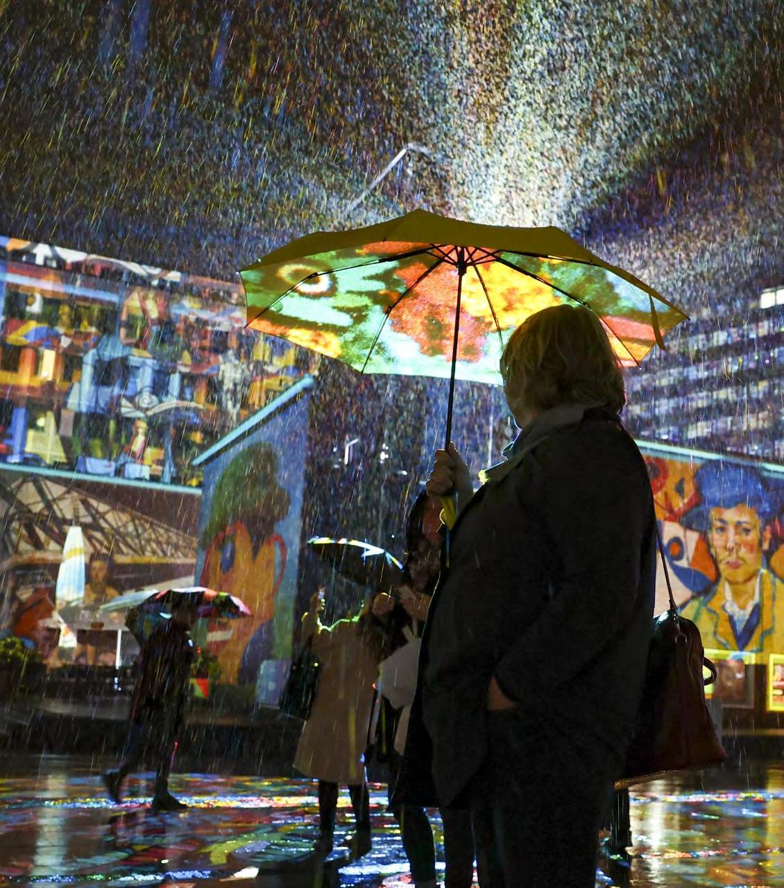 Personas visitan la iluminación de la plaza Kennedy Platz, durante el Festival de la Luz en Essen (Alemania). Del 2 al 13 de octubre, edificios y plazas se iluminaron con instalaciones de luz y proyecciones en 3D. EFE