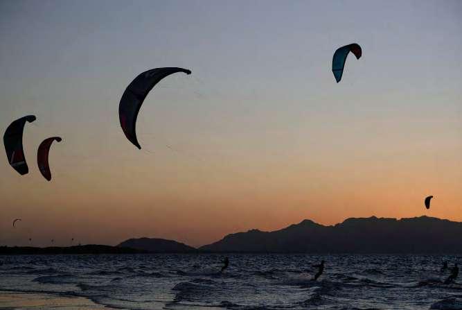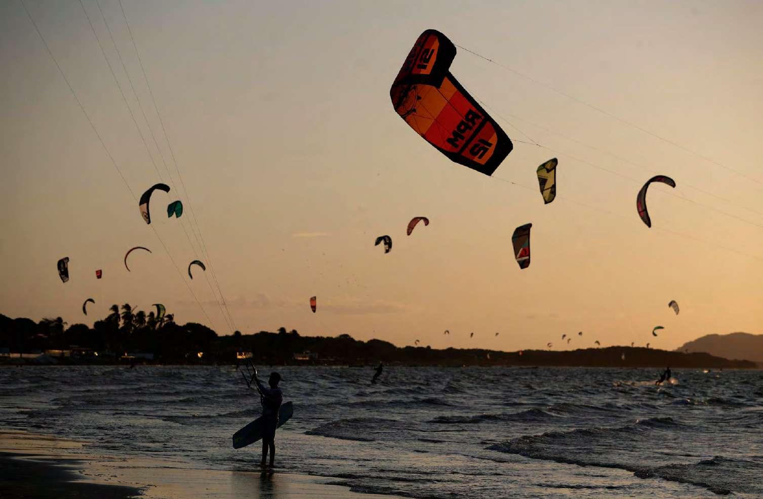 Este es un destino muy visitado para practicar kitesurf. En este deporte usan la fuerza del aire para elevarse. Un hombre prueba su cometa para practicar kitesurf. Personas observan a practicantes en el mar. Una mujer aprende a controlar la cometa.