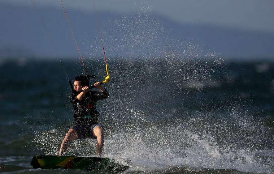 Se compite en varias disciplinas: Freestyle, Olas, el Hang Time o el Racing. En el kite surf existen dos asociaciones que organizan las principales competiciones. Una mujer aprende a controlar la cometa para practicar kitesurf. Los kiters van de los seis a los 60 años aproximadamente. Las piruetas en el aire son llamativas.