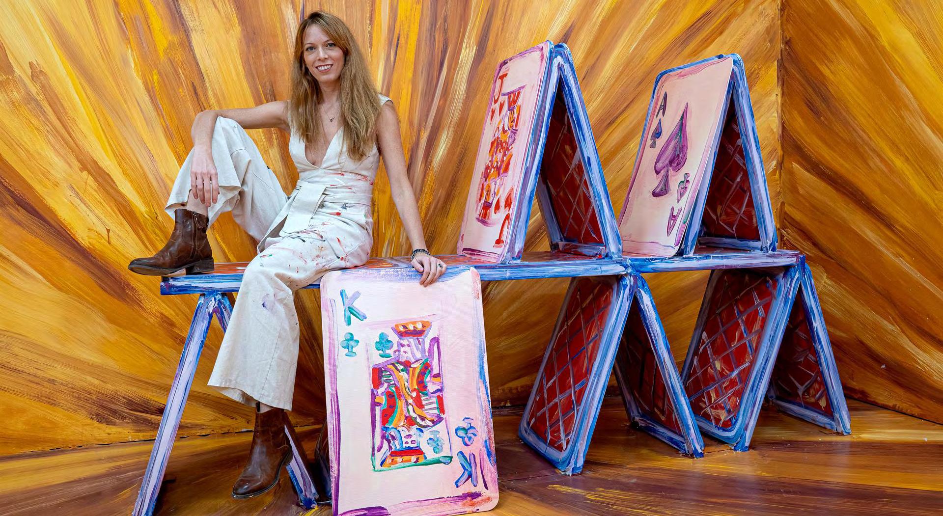 “Quiero que las personas que vengan a la exposición se maravillen y experimenten una sensación de asombro Quiero que se pierdan en el arte y que sean realmente transportados a este mundo de ensueño”, dice la artista sentada entre dos caballos de ajedrez y un túnel psico délico iluminado por tubos de neón.