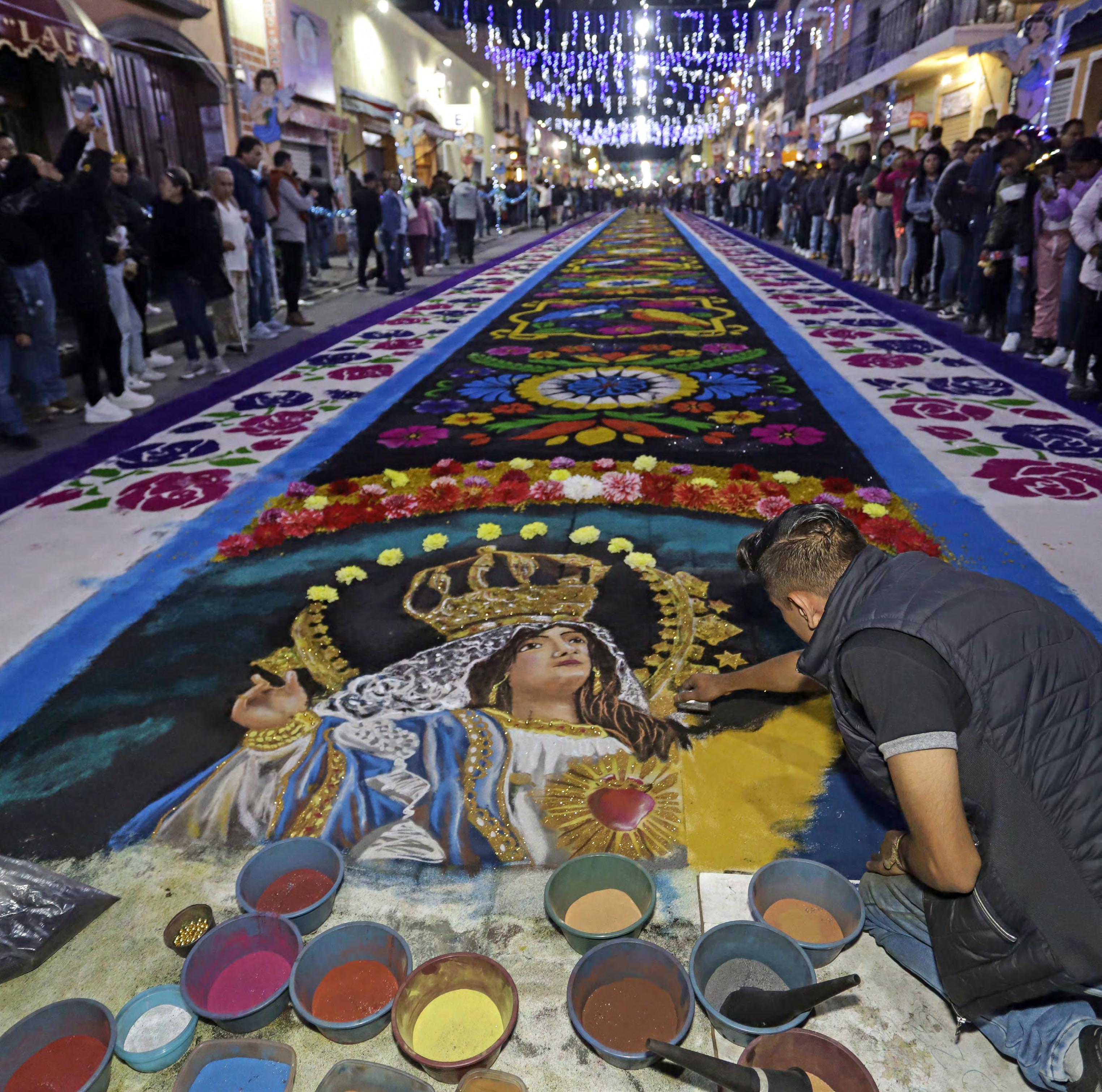 Tapetes monumentales de aserrín de colores de hasta 100 metros de largo realizados por artesanos se desplegaron este 15 de agosto de 2024 en una ruta de 7 kilómetros que simboliza el paso de la Virgen de la Caridad en las calles de Huamantla, municipio de Tlaxcala, estado en el centro de México. EFE