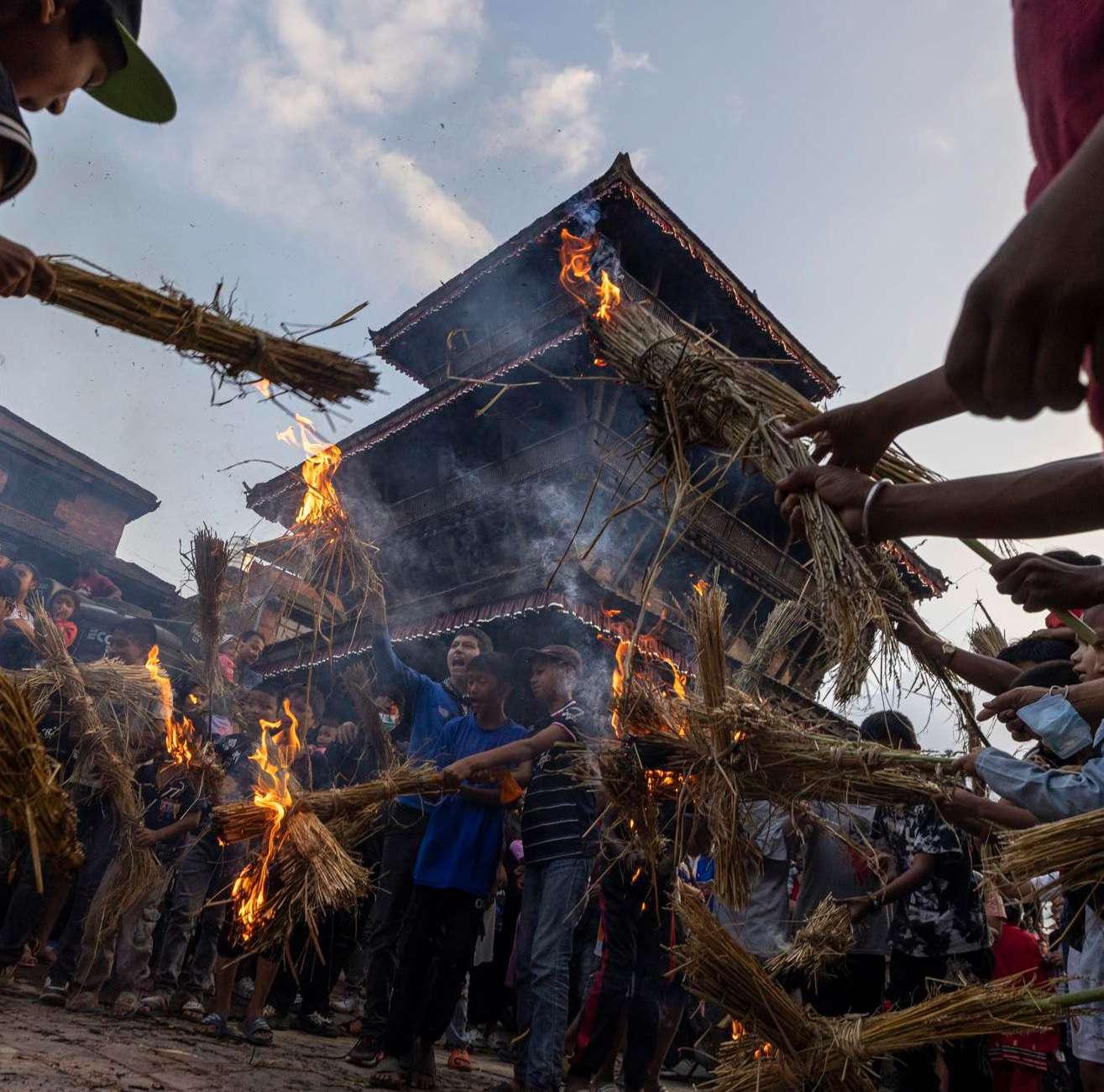 Ciudadanos nepalíes queman una efigie de paja del mítico demonio ‘Ghanta Karna’ durante las celebraciones del festival hindú Gathemangal en Bhaktapur, Katmandú, Nepal. (EFE/ Narendra Shrestha)