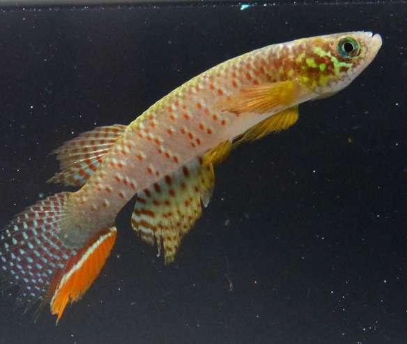 Este peculiar pez llega a medir unos cinco centímetros; su cuerpo es plomo verdoso y tiene un patrón de puntos de colores; las aletas, principalmente de la cola, es vistosa y grande, y vive en