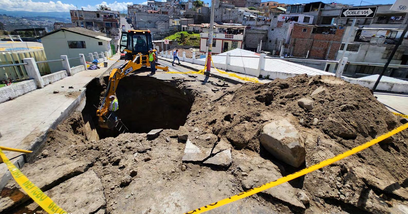La causa Guillermo Proaño, subdirector de la Dirección de Operación y Mantenimiento (DOM) de la Emapa, indicó que “a causa de las fuertes lluvias registradas y el arrastre de material, se produjo el colapso de un pozo de revisión de la zona”.