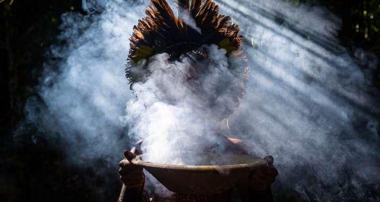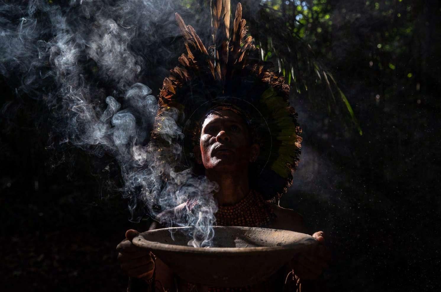 El líder indígena de la etnia Pataxó, Ytapoã Aguiar, participa en una ceremonia de purificación, el 8 de marzo de 2023.
