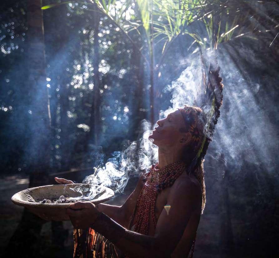 La indígena de la etnia Pataxó, Tamikua Estrela, participa en una ceremonia de purificación.