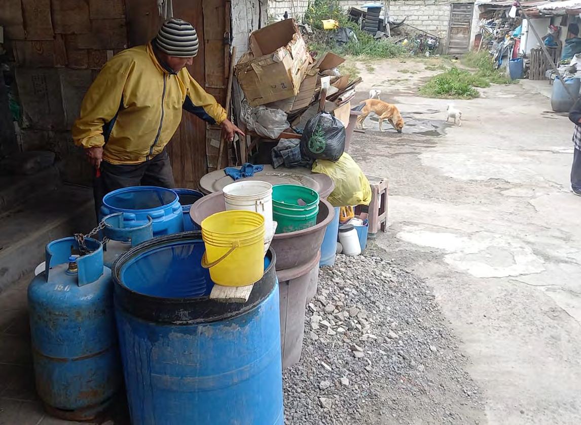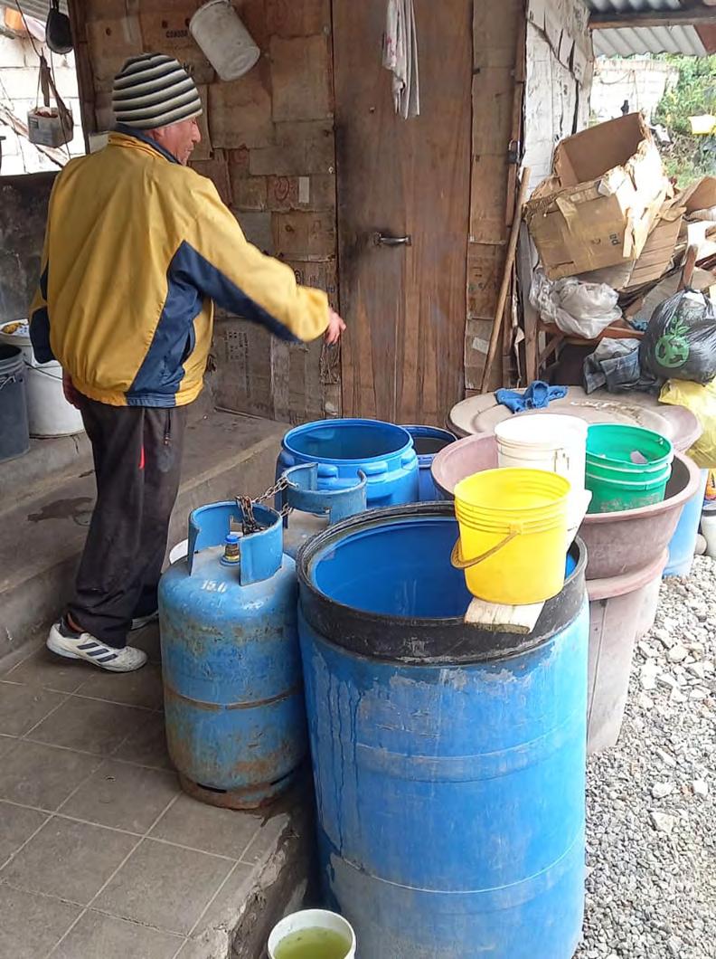 Para tener líquido vital que es utilizado para cocinar y asearse durante los cortes de servicio , el adulto mayor se levanta a las 06:00 para llenar los tanques, baldes y demás recipientes que adecua en el patio de su casa para almacenar agua.