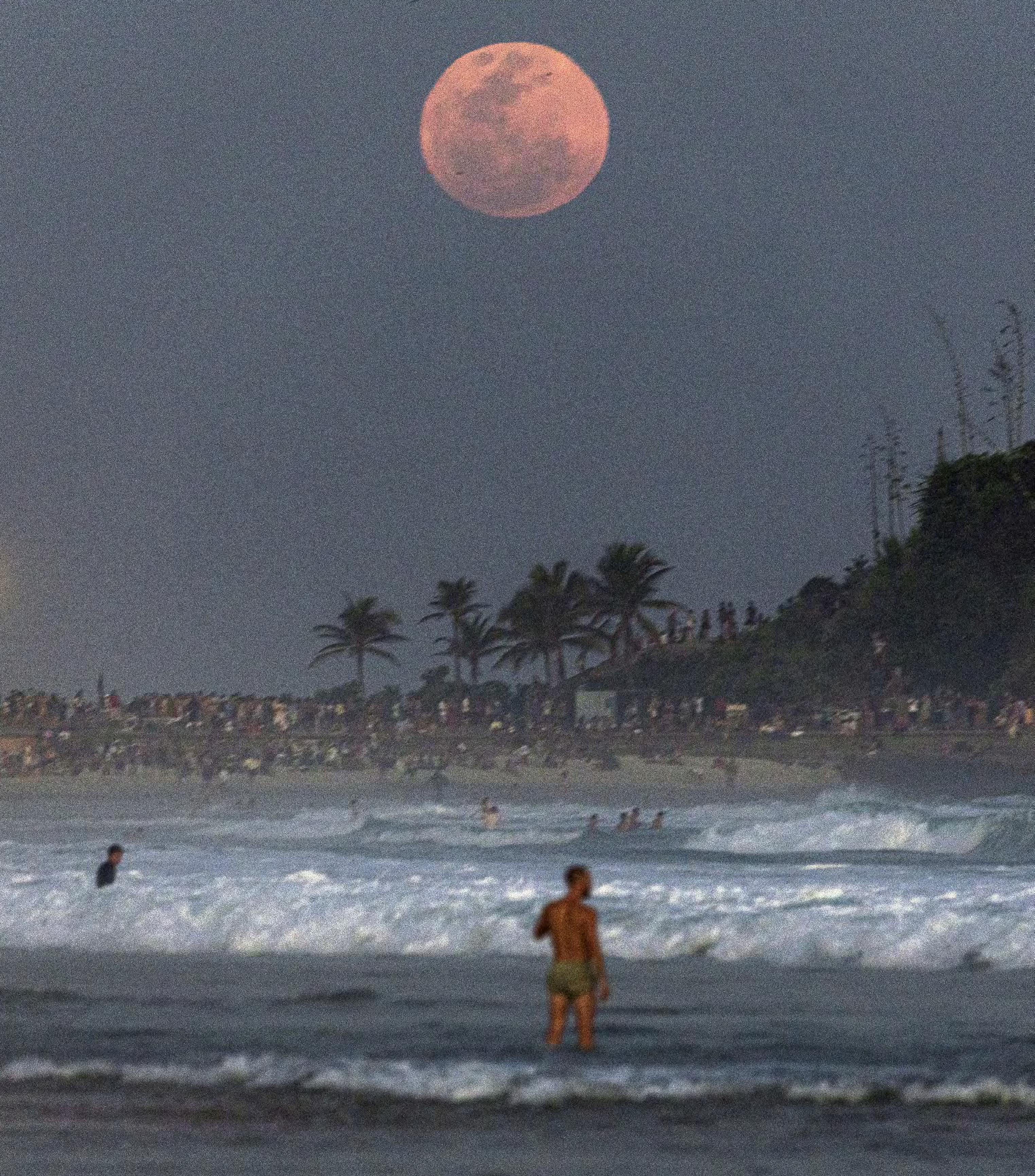 Fotografía de la superluna azul desde la playa de Arpoador, en la zona sur de la ciudad de Río de Janeiro (Brasil). La superluna, la primera de 2024, es un fenómeno que ocurre cuando la luna llena coincide con el momento en que esta se encuentra en el perigeo, el punto de su órbita más cercano a la Tierra. EFE