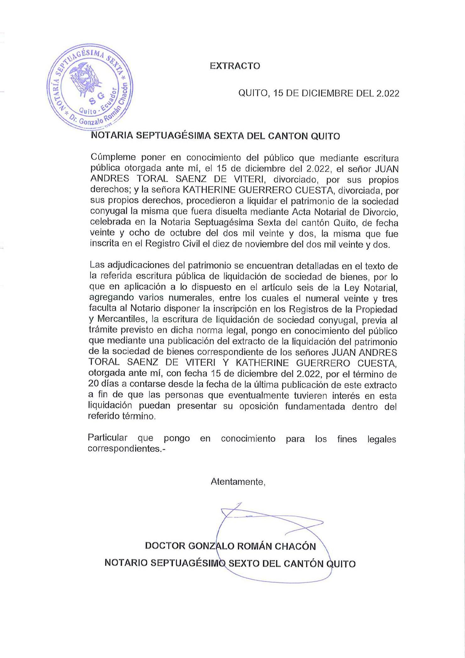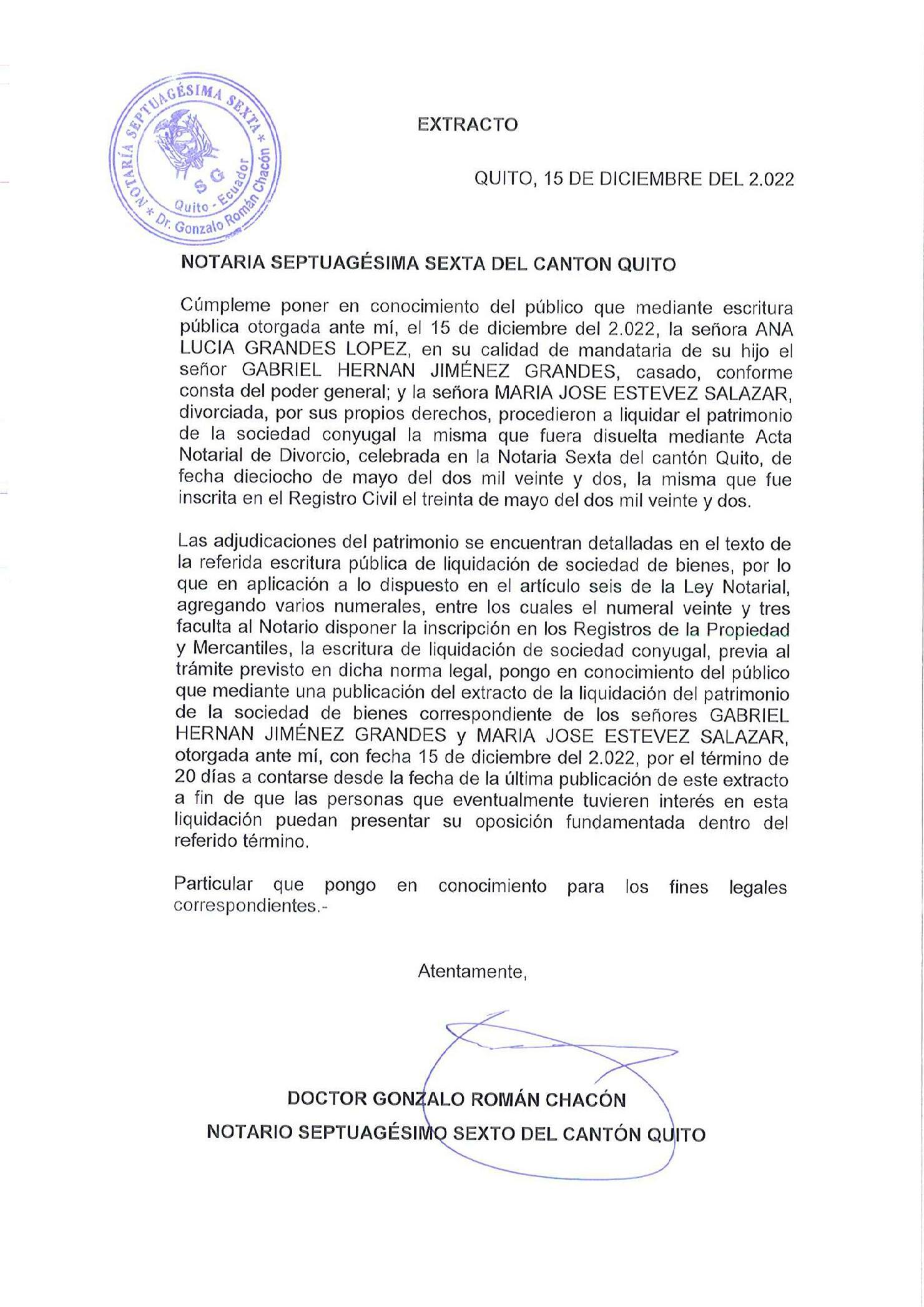 Se pone en conocimiento del público en general y a quienes pudieran tener algún interés en este acto, que se va proceder a la inscripción de la escritura pública que contiene la LIQUIDACIÓN DE LA SOCIEDAD CONYUGAL, habida entre los ex cónyuges señores MARIANA ENITH QUEZADA QUEZADA Y OSWALDO DE JESÚS AMBULUDÍ ROBLES, convenio celebrado mediante escritura pública ante la Notaría Primera del cantón Loja, el día veintidós de diciembre de dos mil veintidós Los interesados podrán oponerse en el término de veinte días, contados desde esta publicación.- Loja, 22 de diciembre de 2022.- De lo cual doy fe la Notaria.-