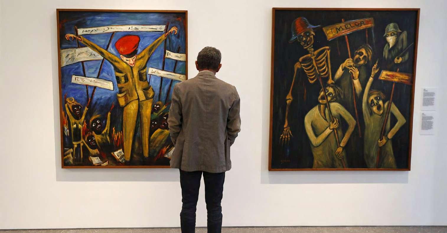 La convulsión política en el arte De esta exposición hacen par te obras como ‘Masacre del 9 de abril’ y ‘El tren de la muer te’, ambas de 1948; ‘Los dere chos de la mujer’ y ‘Huelga de estudiantes’, las dos de 1954; ‘La República’ (1957) y ‘Ple biscito’ (1958), entre otras, que son un retrato de la convul sión política colombiana.