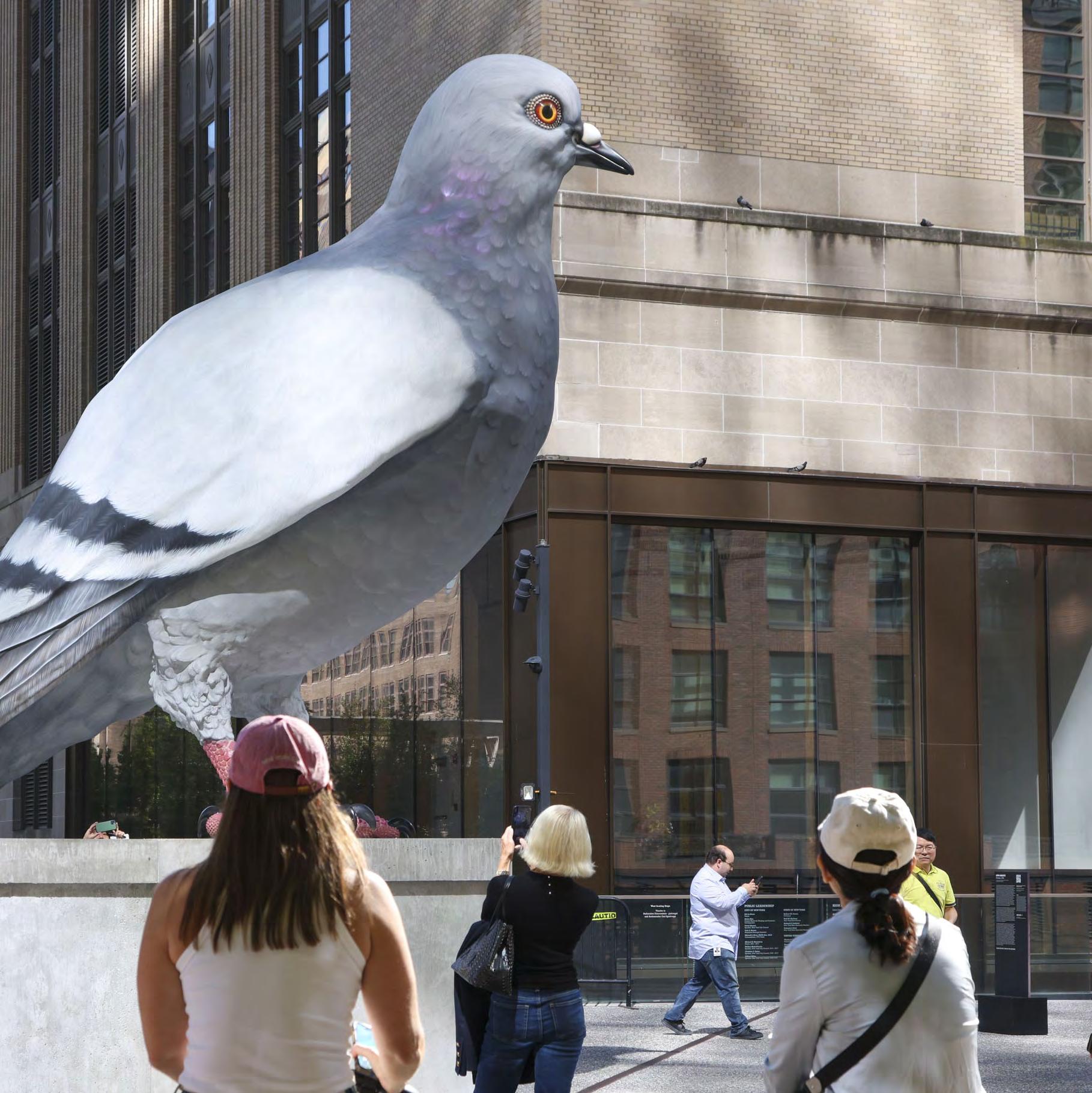 La gente pasa por ‘Dinosaurio’, una escultura hiperrealista de una paloma fundida en aluminio y creada por el artista colombiano-francés Ivan Argote. La obra se exhibirá en el High Line Plinth en Nueva York (EE.UU.) durante 18 meses. EFE