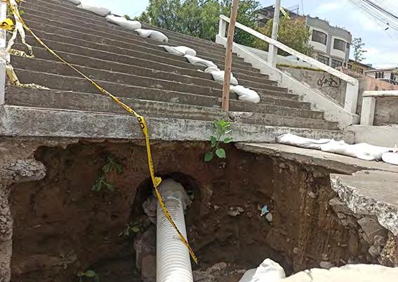 Un tramo de grada, que debe tener unos 40 centíme tros de ancho, limitado a la izquierda por una base de madera y a la derecha por un agujero, donde se ve el estado de la tubería, es por donde pueden caminar.