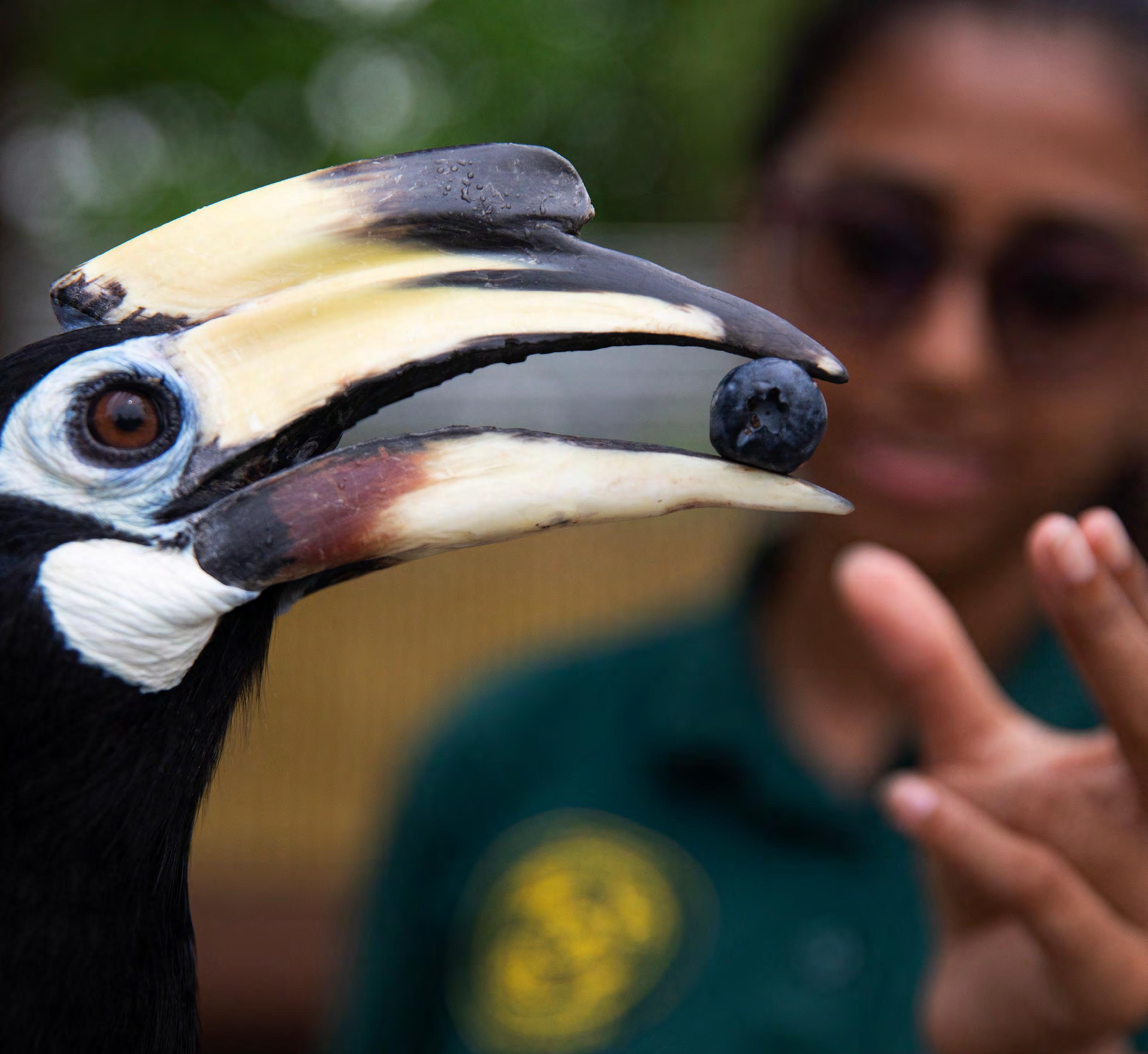 La encargada del parque de aves, Harishmitha Ganesan, alimenta con un arándano a Sally, un cálao oriental de varios colores y también la mascota del aviario ‘Alas de Asia’, en el Paraíso de aves de Singapur, uno de los parques de aves más grandes de Asia, que abrirá al público el 08 de mayo de 2023. El parque de 17 hectáreas alberga 3.500 aves de 400 especies, de las cuales el 24 % están amenazadas. EFE