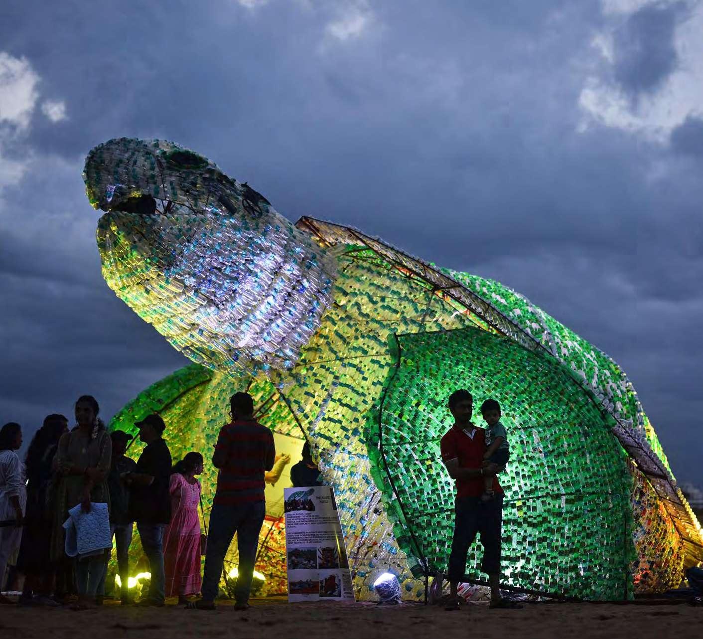 La gente se para cerca de una enorme réplica de la tortuga marina verde hecha de botellas usadas para crear conciencia entre el público contra el uso de plástico de un solo uso y su efecto en la vida marina, en la playa de Edward Elliot en Chennai, India.