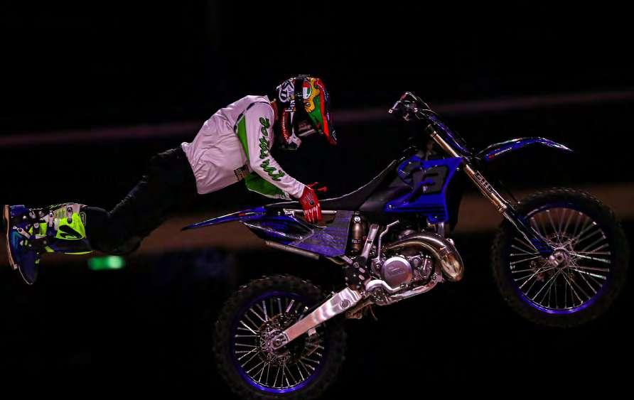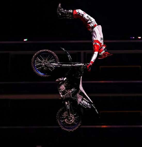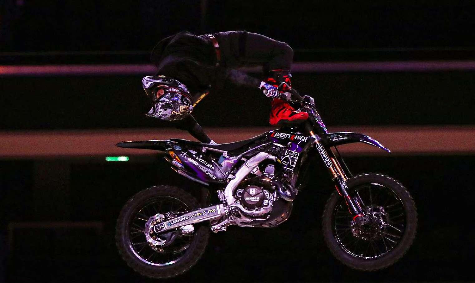 Alex Bucholtz de Australia ejecutando otra acrobacia. Paron, miembro de los Crusty Demons, también mostró su espectáculo. Frantisek Maca mostrando todo lo que puede hacer en su motocicleta. Alex Bucholtz a punto de sujetarse del asiento de su motocicleta. Remi Bizouard de Francia, en paralelo con su motocicleta.