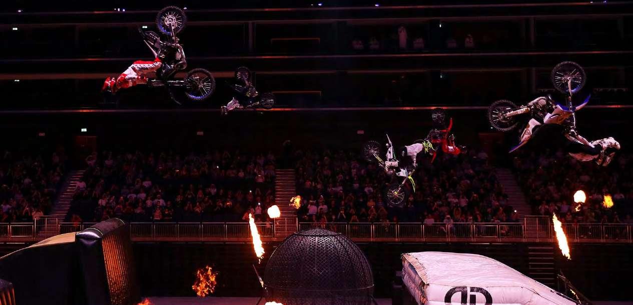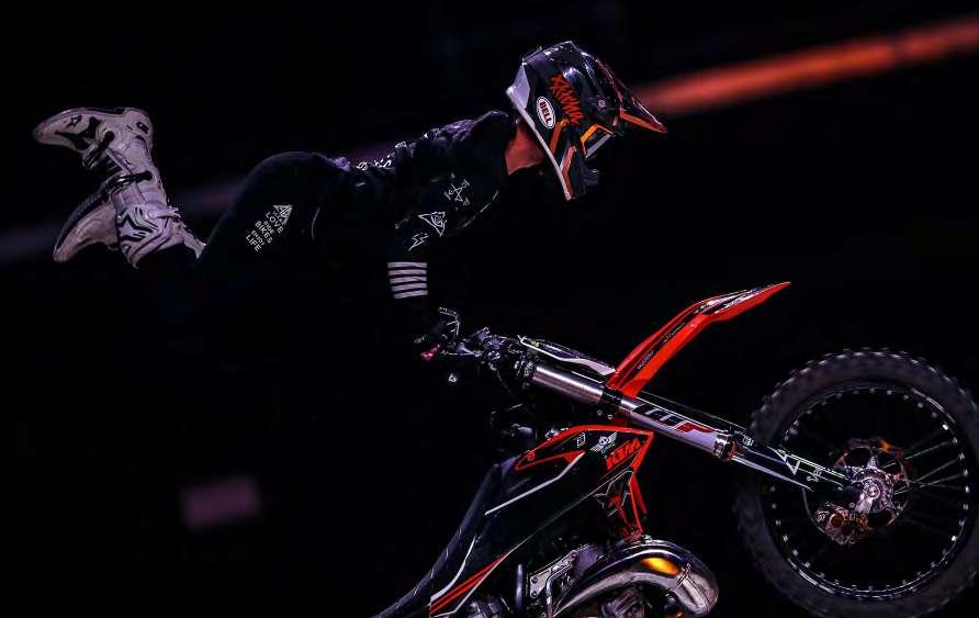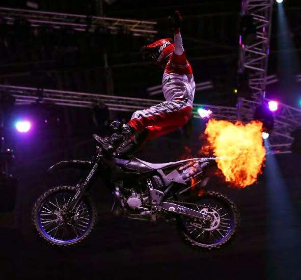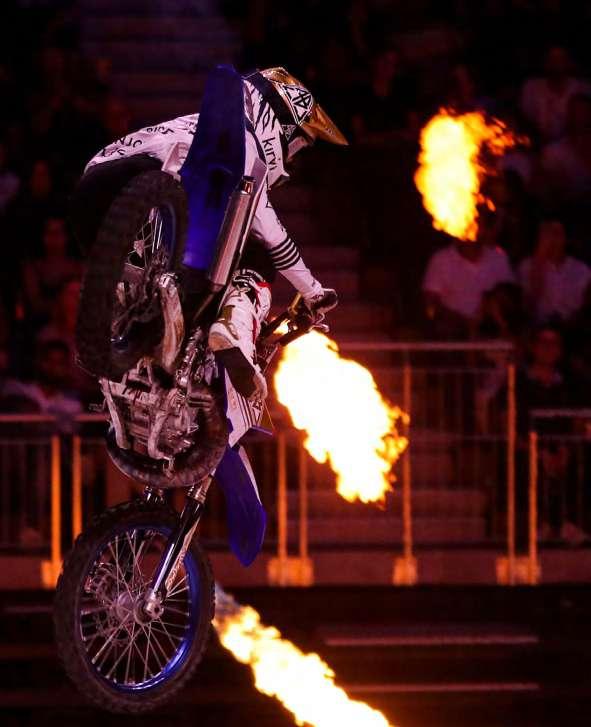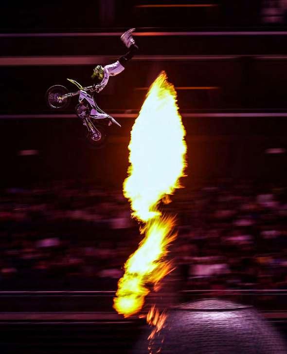 El fuego también es parte importante del espectáculo. En la fotografía Filip Podmol de República Checa. Frantisek Maca hace una acrobacia etilo libre en el aire. Varios miembros de Crusty Demons en la pista. Jake Smith sorprendiendo al público. Una mota más cerrada de Filip Podmol.