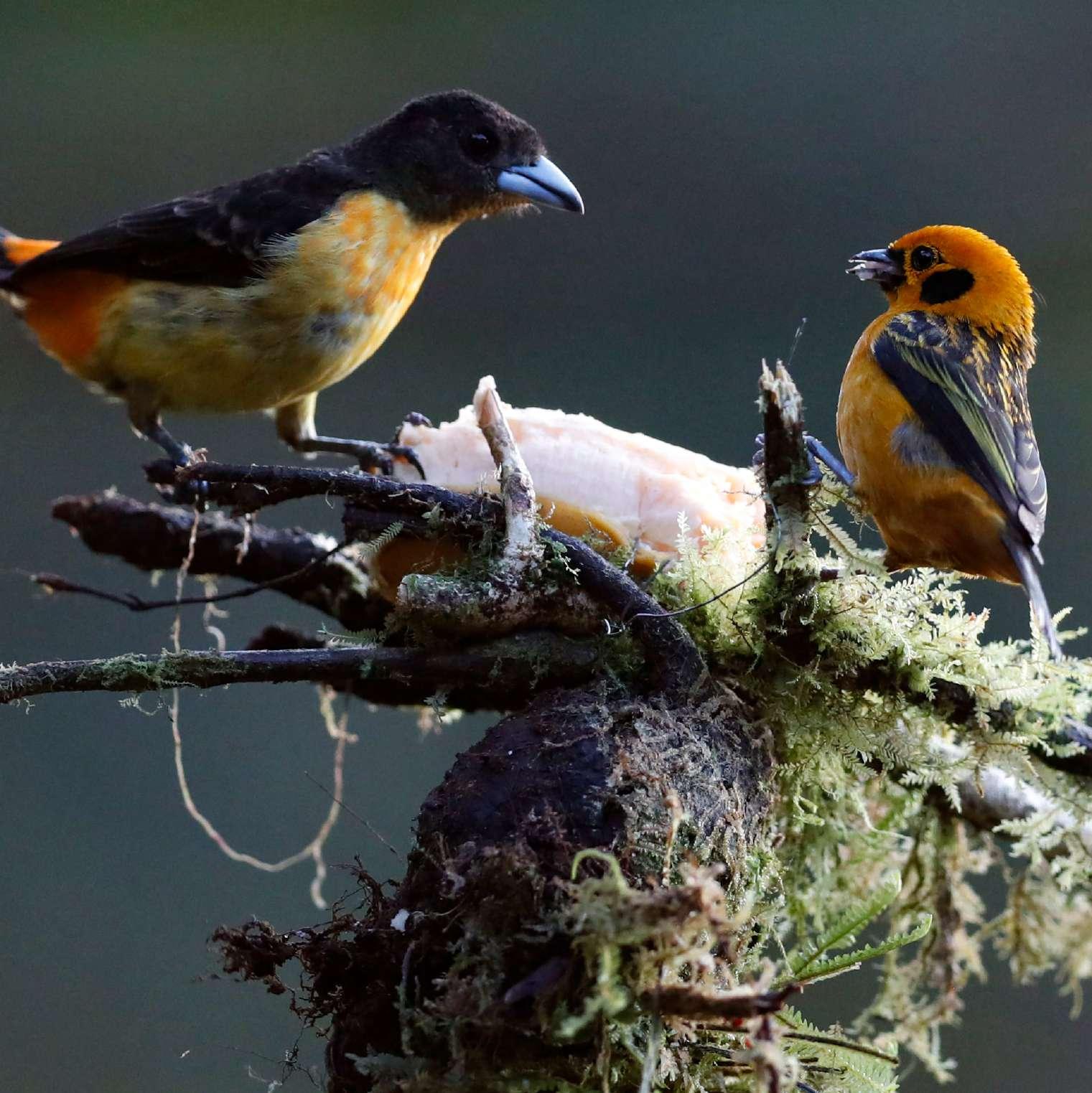 Fotografía de aves de las especies Ramphocelus Flammigerus (i) y una Tangara Arthus (d), en la finca La Florida, en Cali (Colombia). En menos de 4.500 metros cuadrados de este bosque nublado hay 460 especies de aves. EFE